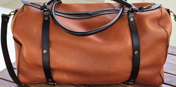 A stylish brown leather duffel bag with black handles and shoulder strap on a wooden surface.